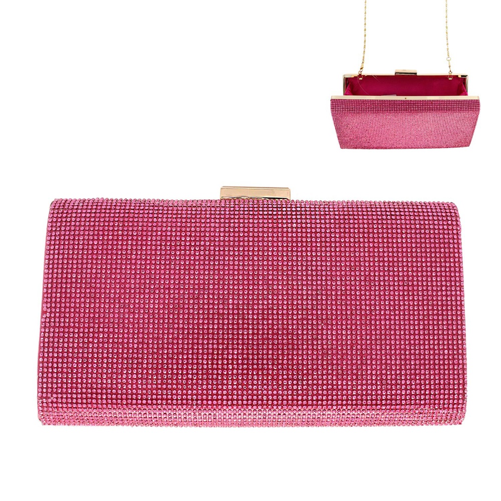CRYSTAL RHINESTONE EVENING BOX CLUTCH PURSE WITH DETACHABLE METAL CHAIN STRAP