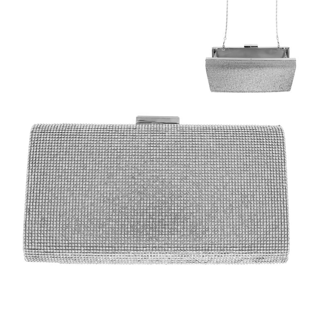 CRYSTAL RHINESTONE EVENING BOX CLUTCH PURSE WITH DETACHABLE METAL CHAIN STRAP