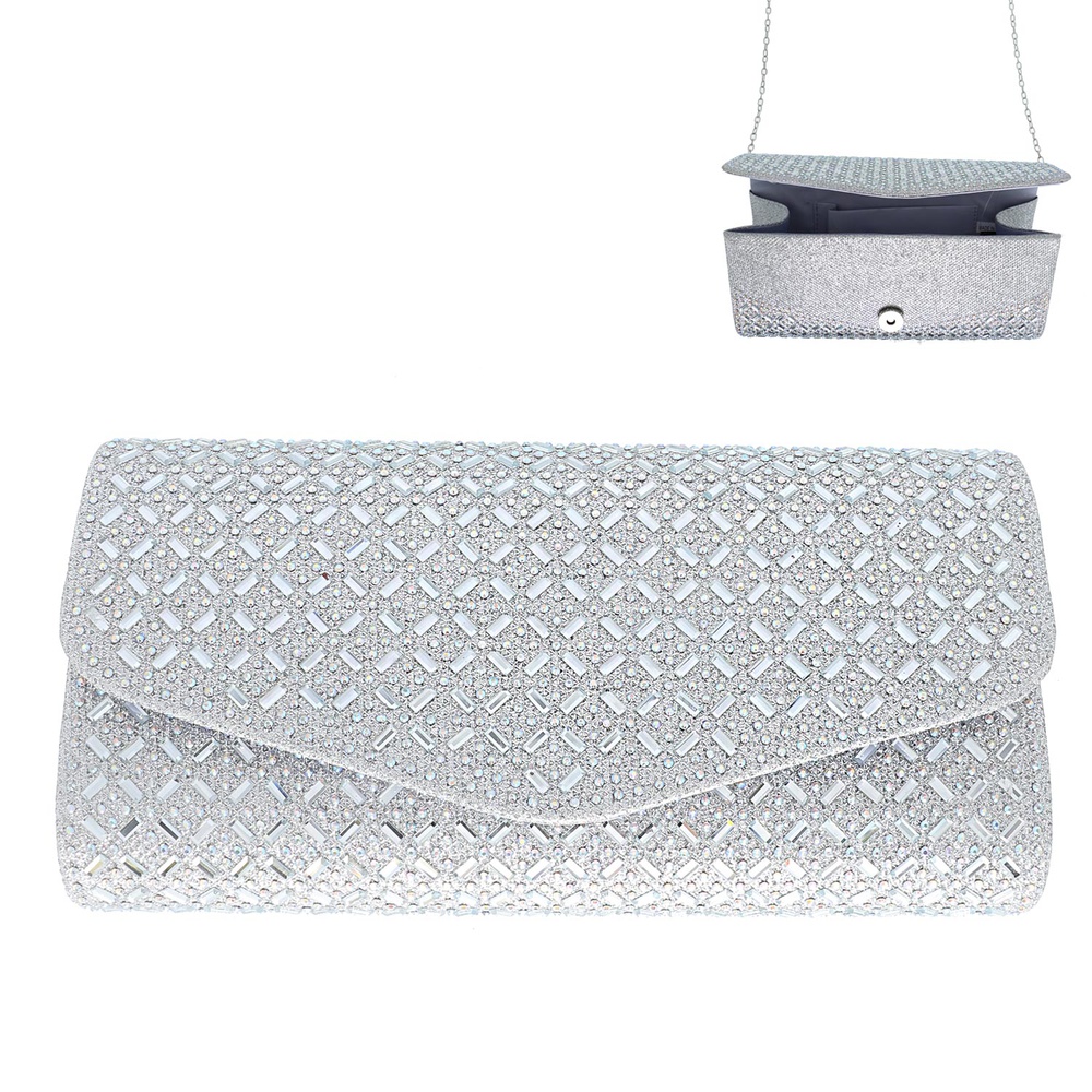 45" INCH STRAP CRYSTAL RHINESTONE EVENING ENVELOPE CLUTCH PURSE WITH DETACHABLE METAL CHAIN STRAP