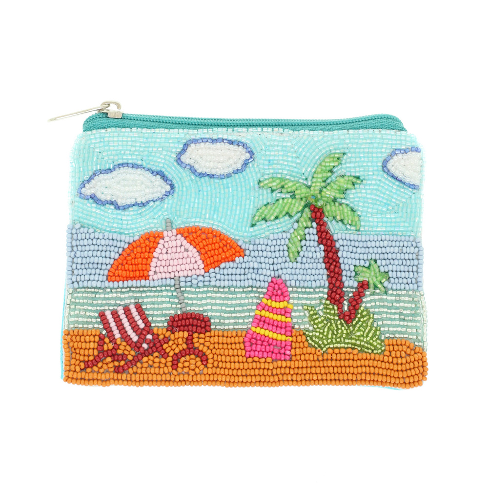BEACH SCENE PALM UMBRELLA SEED BEAD ZIP TOP COIN BAG