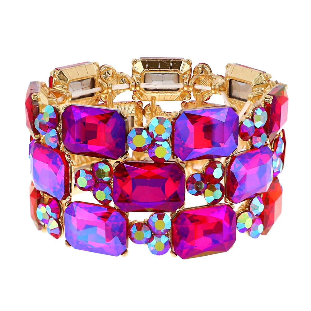 3-row Crystal Rhinestone Octagon Cut Cluster Stretch Bangle Bracelet