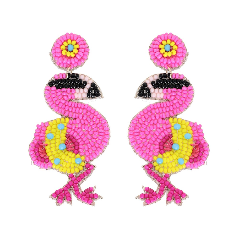 2-tier Tropical Flamingo Beaded Embroidery Long Drop Earrings