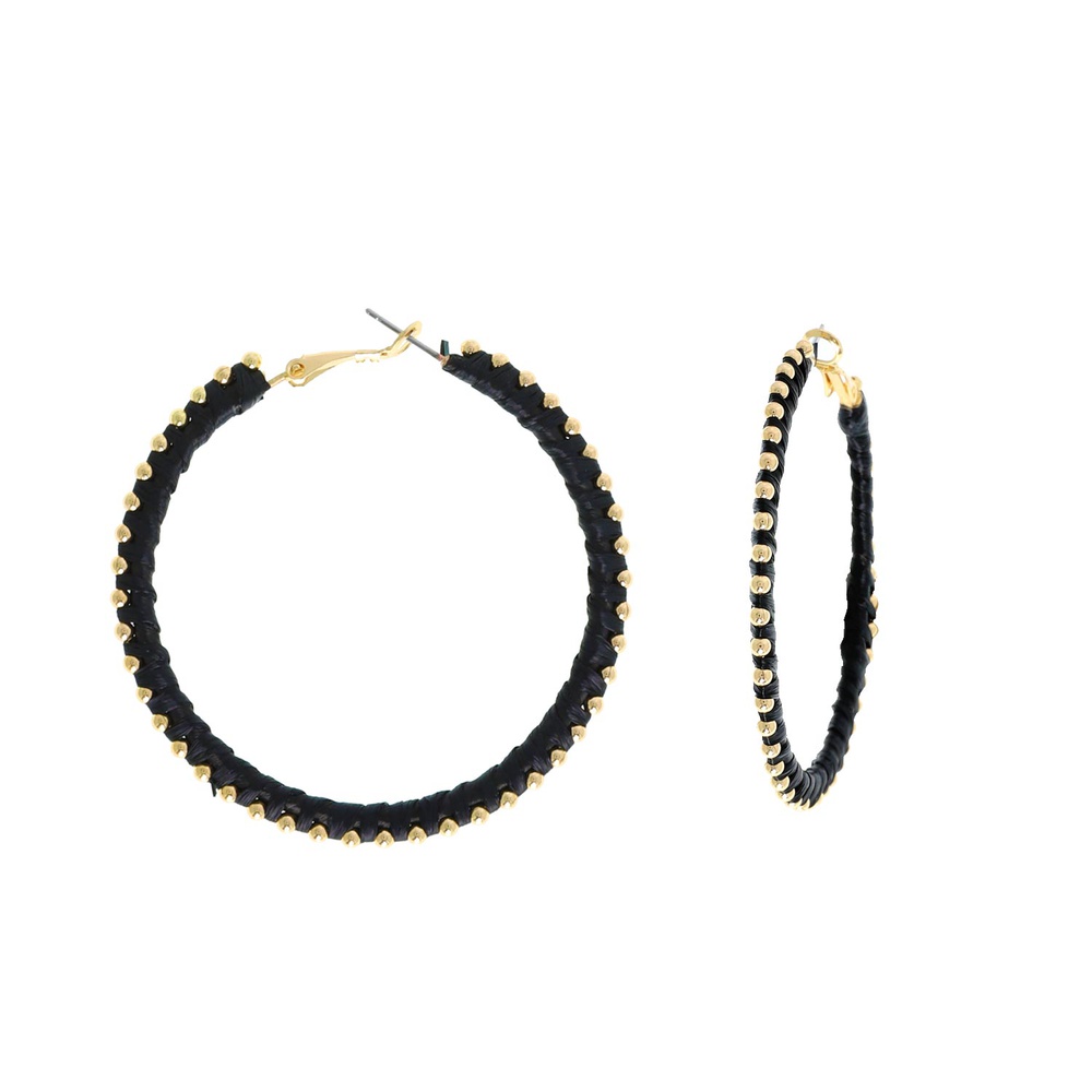 RAFFIA WRAPPED BEADED HOOP EARRINGS IN GOLD TONE METAL