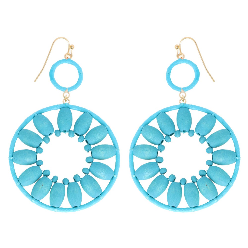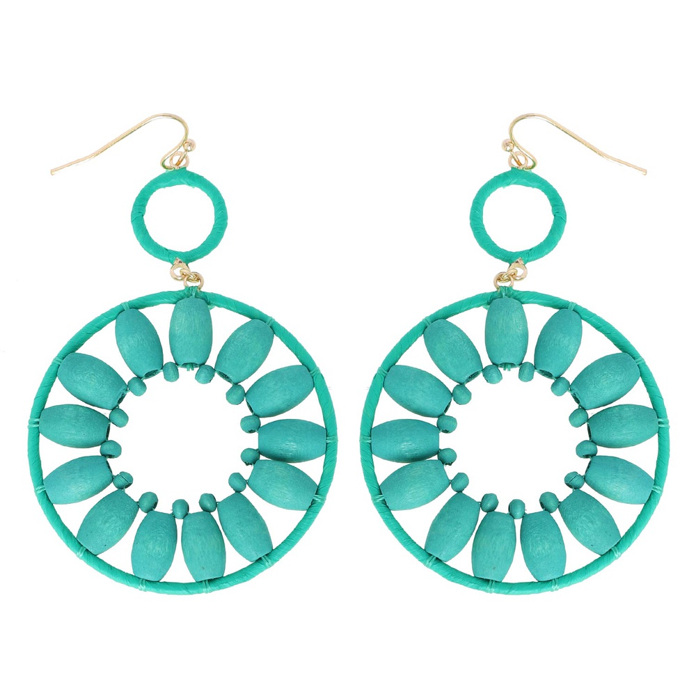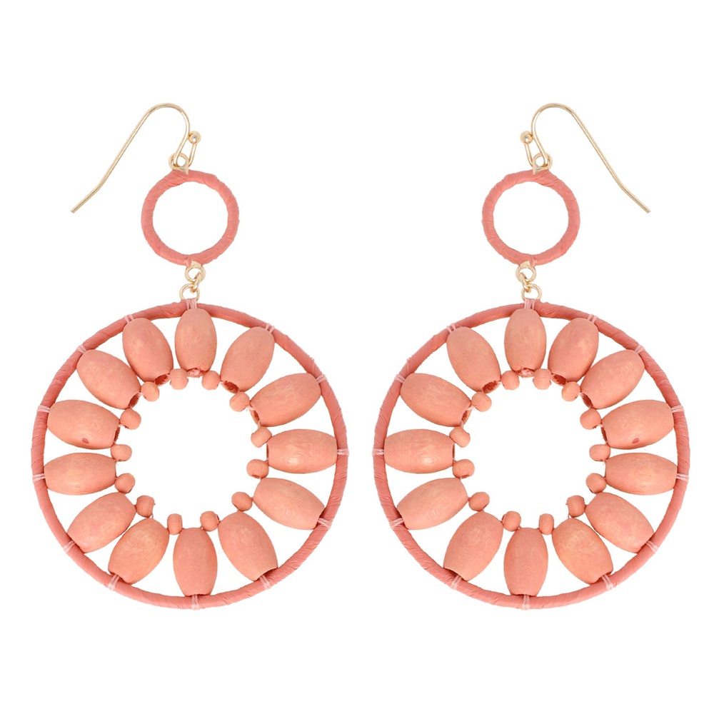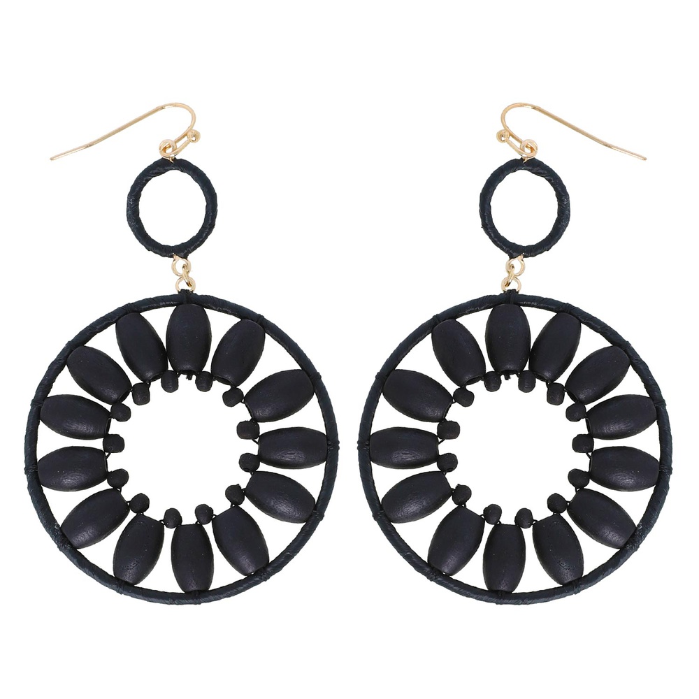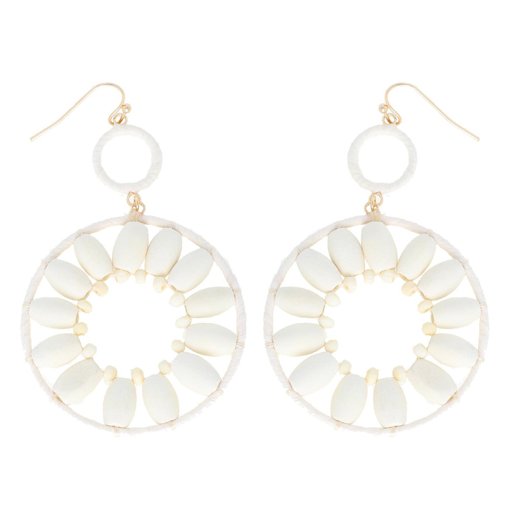 2-tier Open Circle Beaded Wooden Floral Earrings In Gold Tone Metal