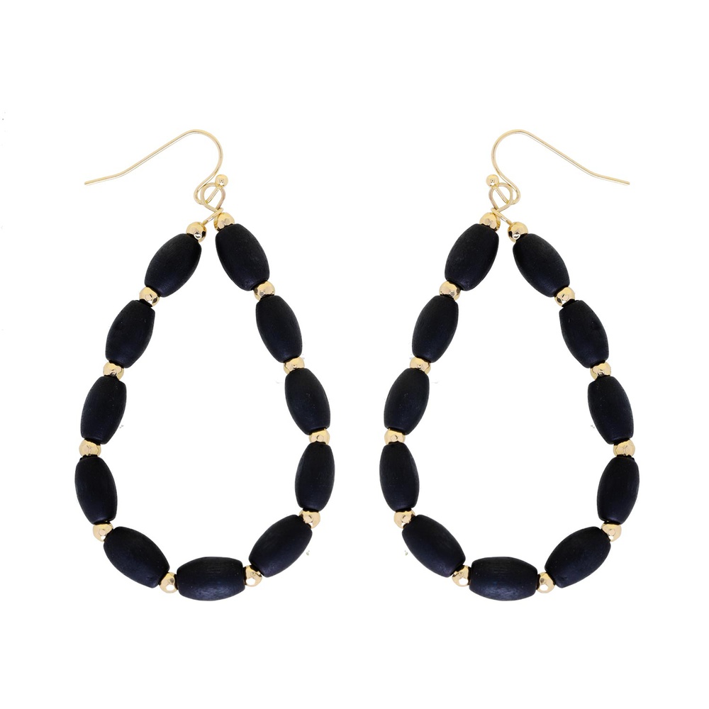 Open Teardrop Beaded Wooden Hook Earrings In Gold Tone Metal