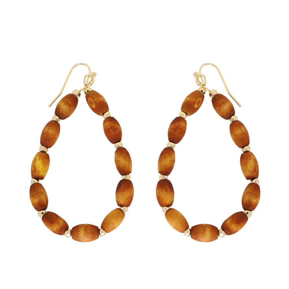 Open Teardrop Beaded Wooden Hook Earrings In Gold Tone Metal