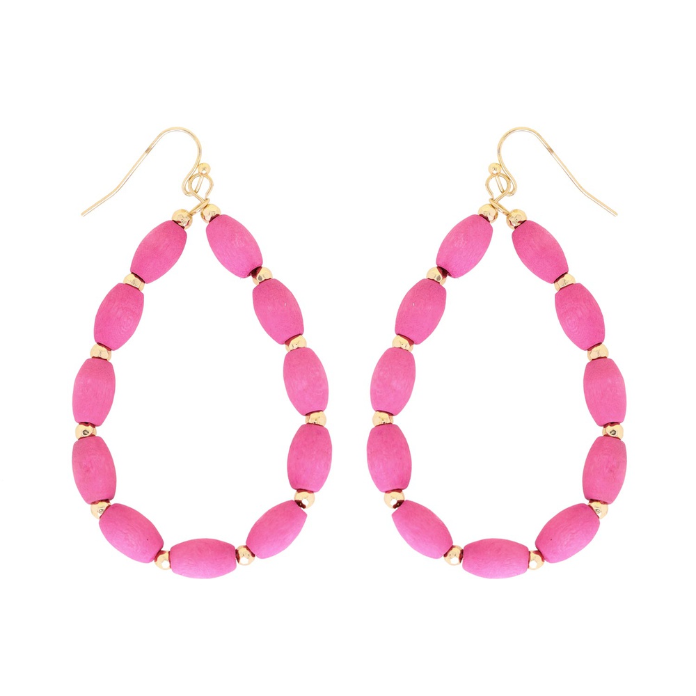 Open Teardrop Beaded Wooden Hook Earrings In Gold Tone Metal