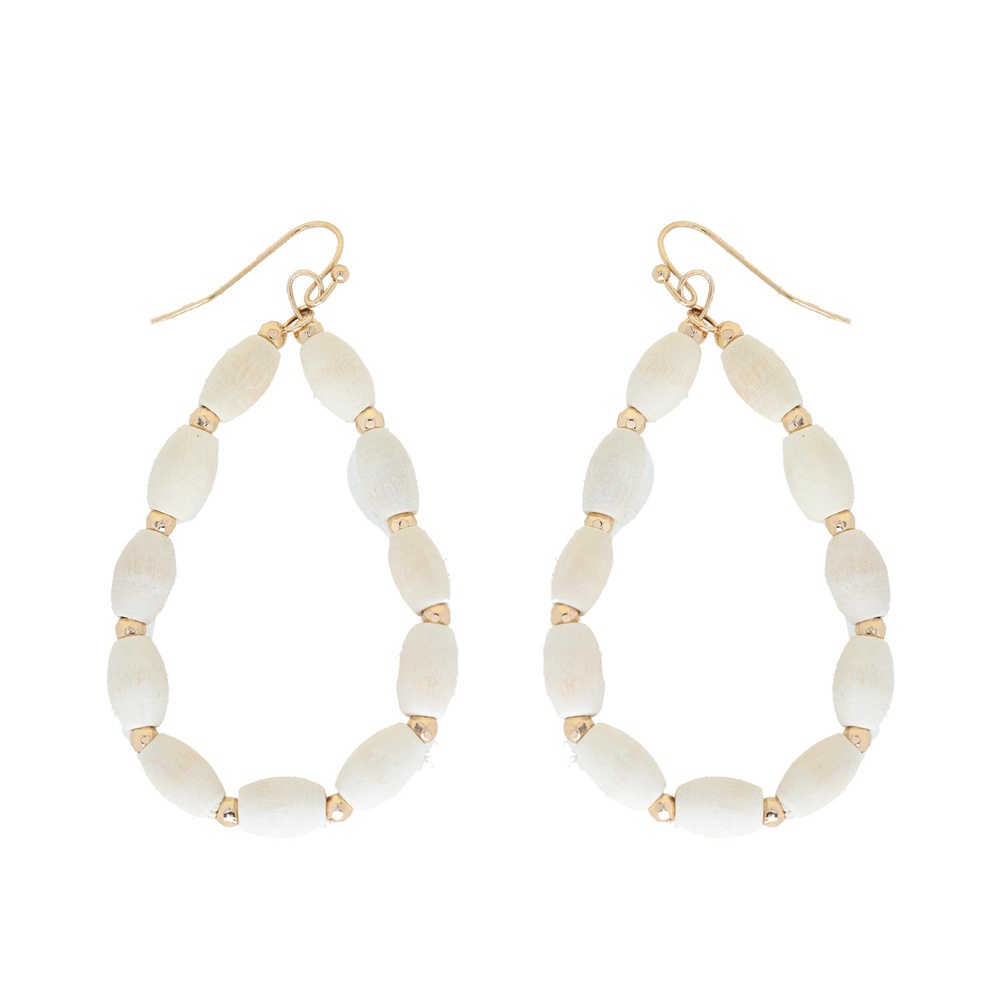 OPEN TEARDROP BEADED WOODEN HOOK EARRINGS IN GOLD TONE METAL