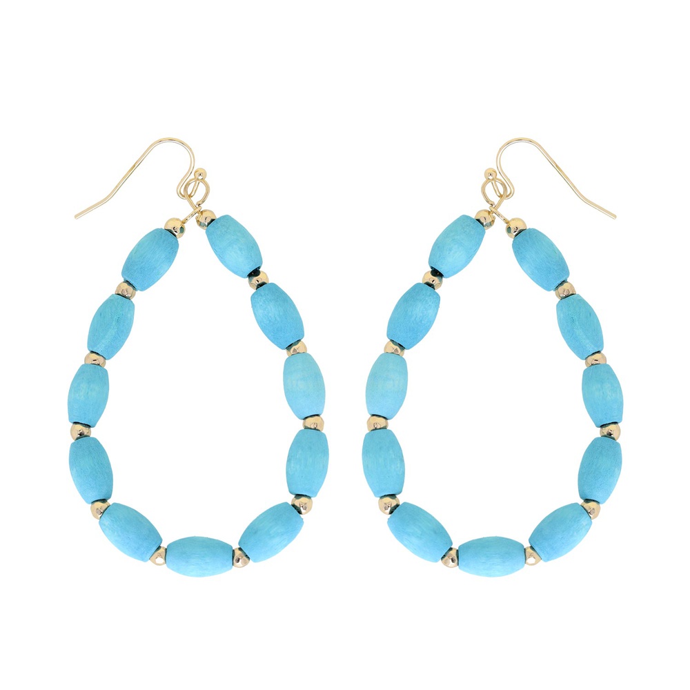 OPEN TEARDROP BEADED WOODEN HOOK EARRINGS IN GOLD TONE METAL