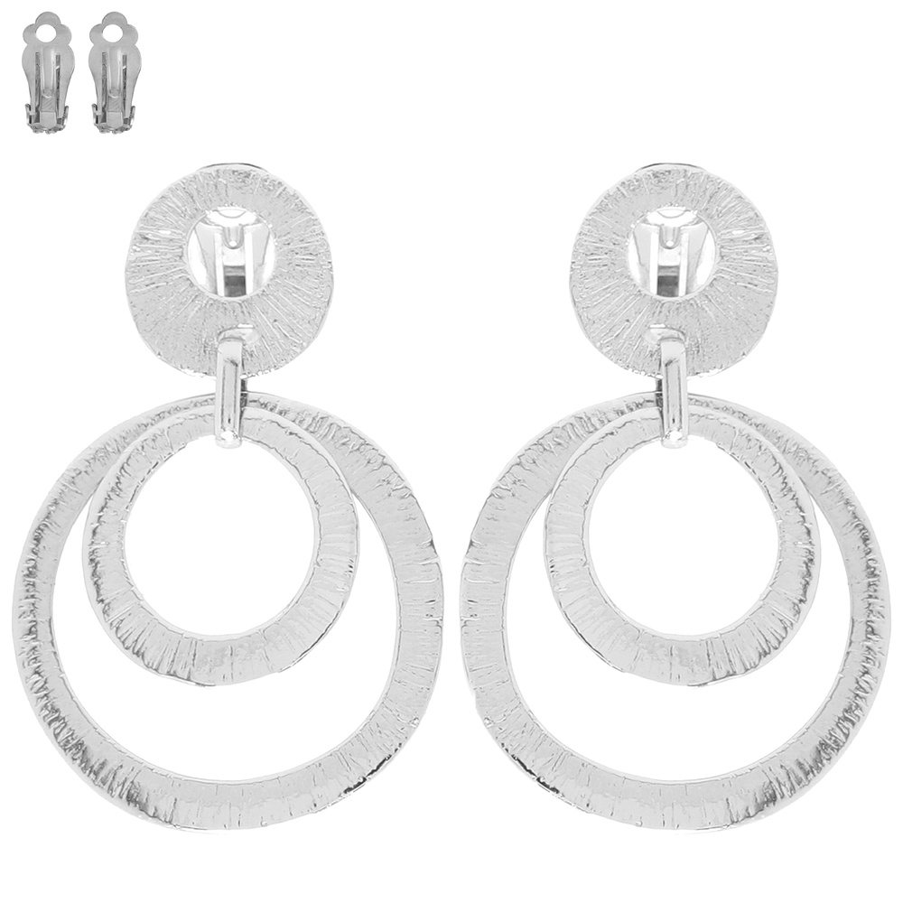 2-TIER BRUSHED METAL DOUBLE OPEN CIRCLE CLIP-ON EARRINGS
