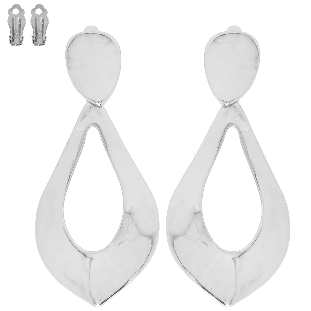2-TIER HAMMERED METAL TEARDROP LONG DROP CLIP-ON EARRINGS