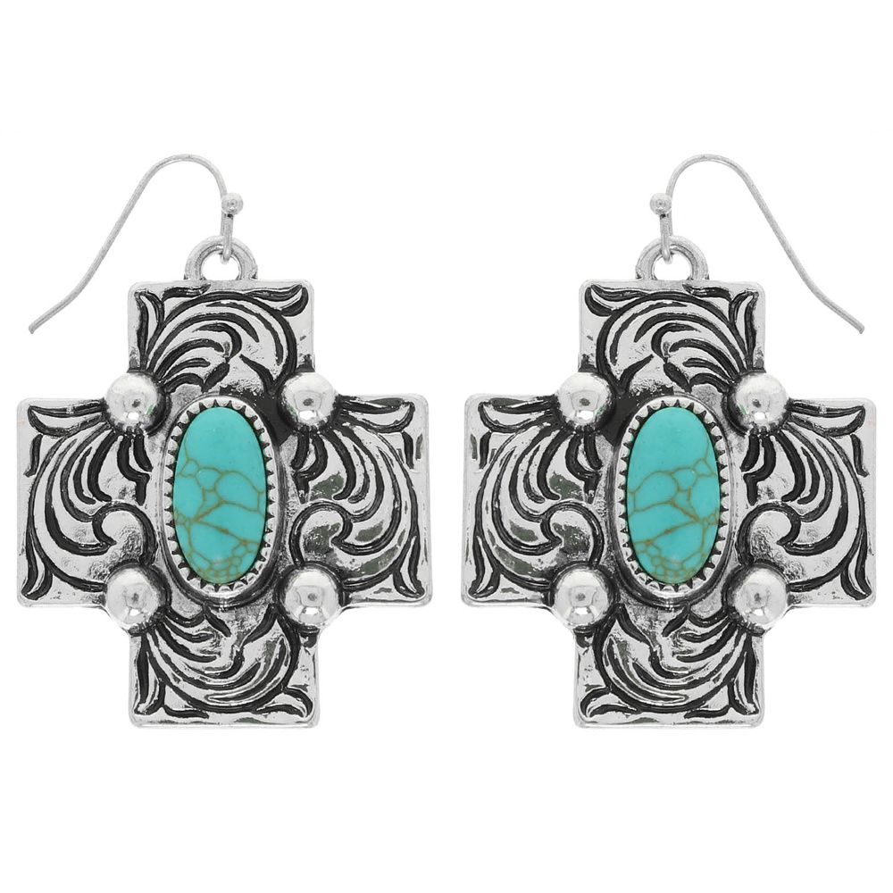 WESTERN SCROLLED TURQUOISE CROSS WESTERN DANGLE EARRINGS