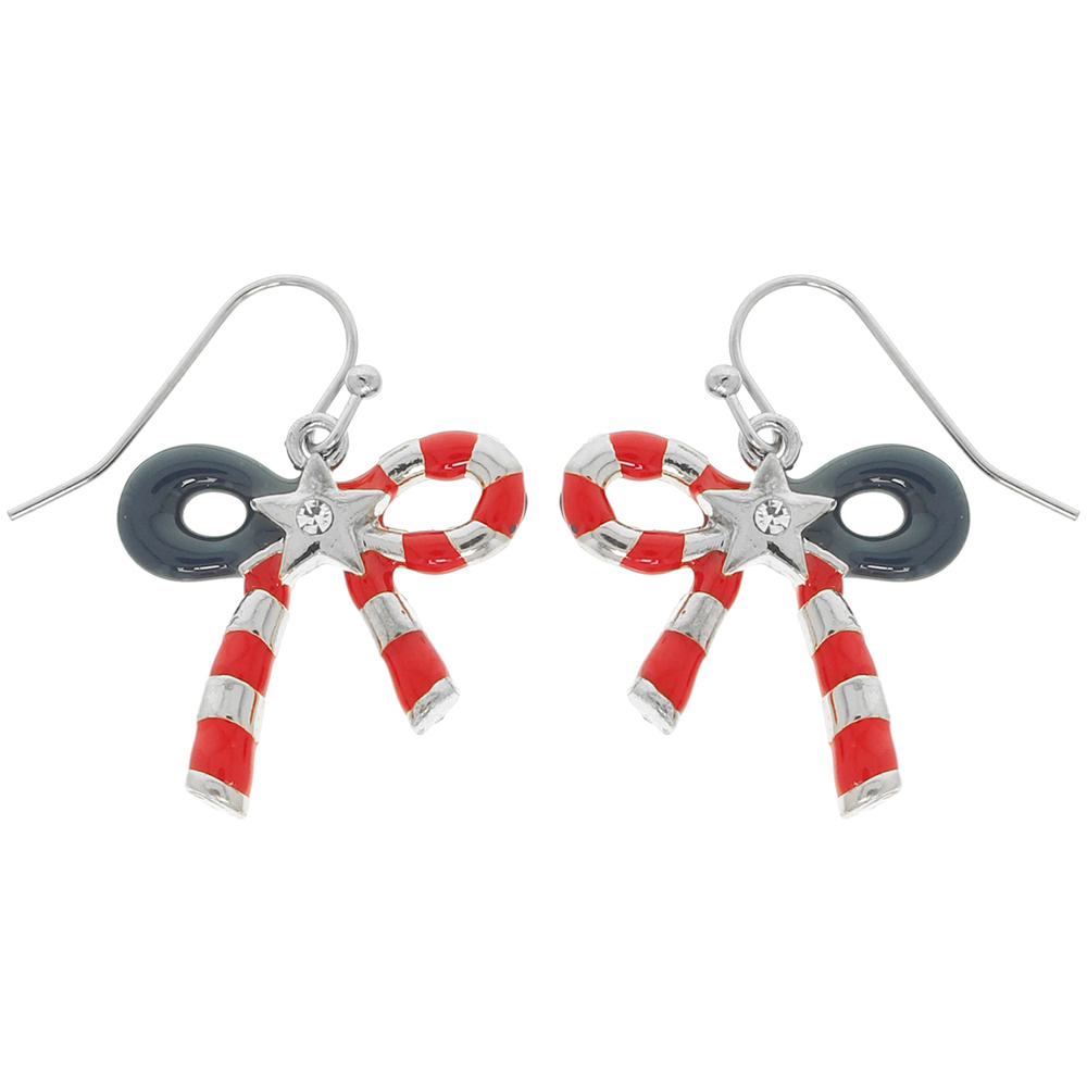 RED WHITE AND BLUE BOW DROP EARRINGS IN SILVER TONE METAL