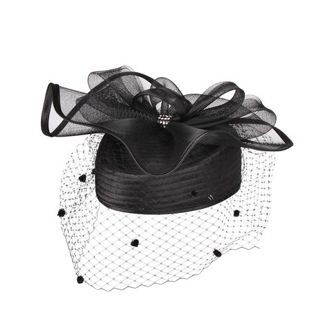 SATIN BRAID PILL BOX HAT W/ MESH BOW & NETTING VEIL