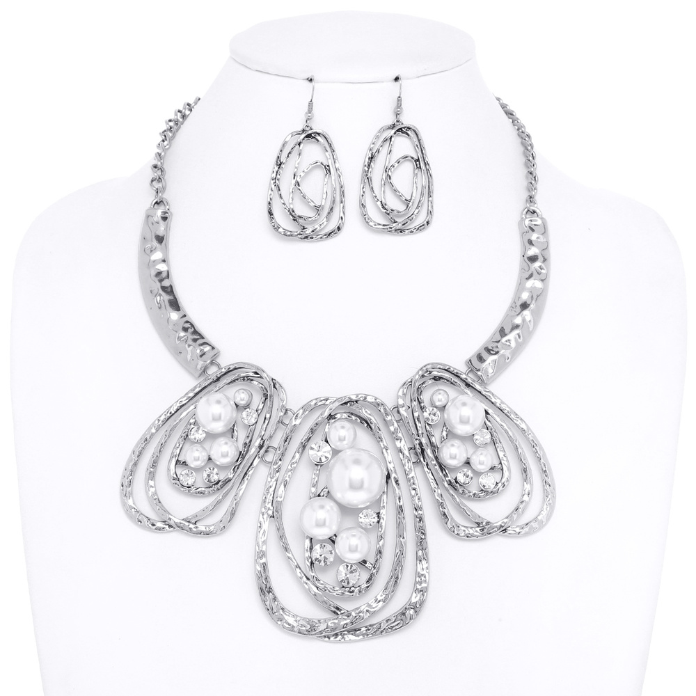 Hammered Metal Crystal Rhinestone And Pearl Adjustable Bib Necklace Earring Set