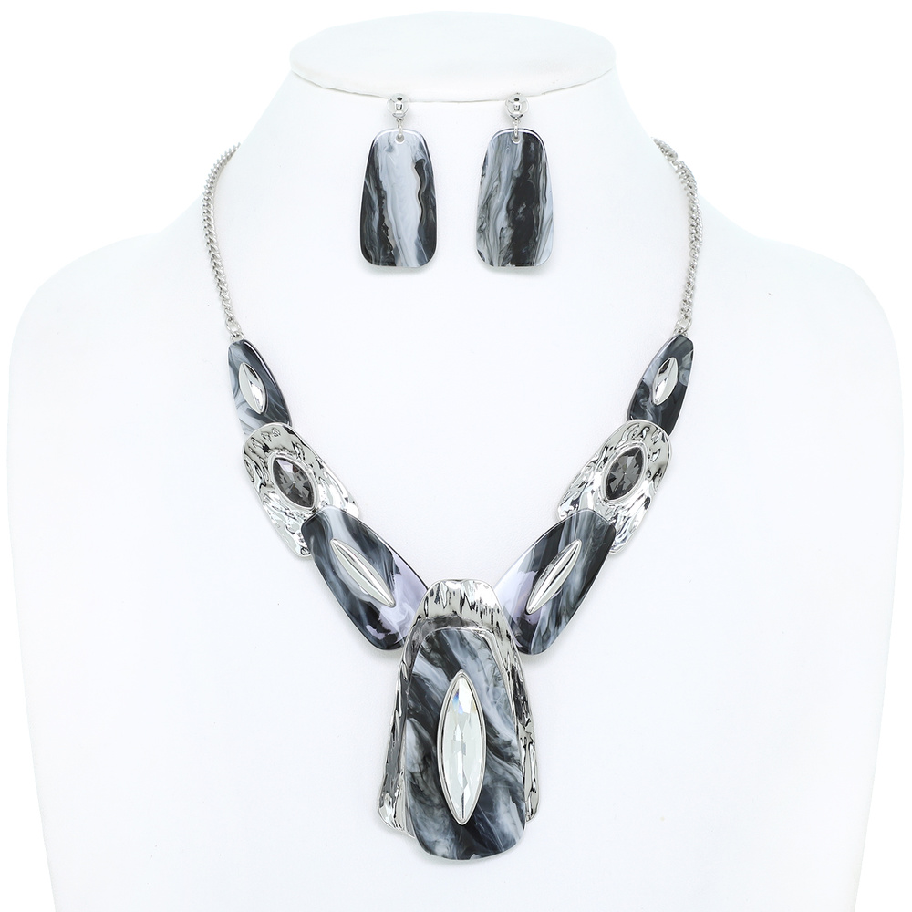 Bohemian Hammered Metal Overlapping Geometric Acetate Lariat Adjustable Necklace Earring Set