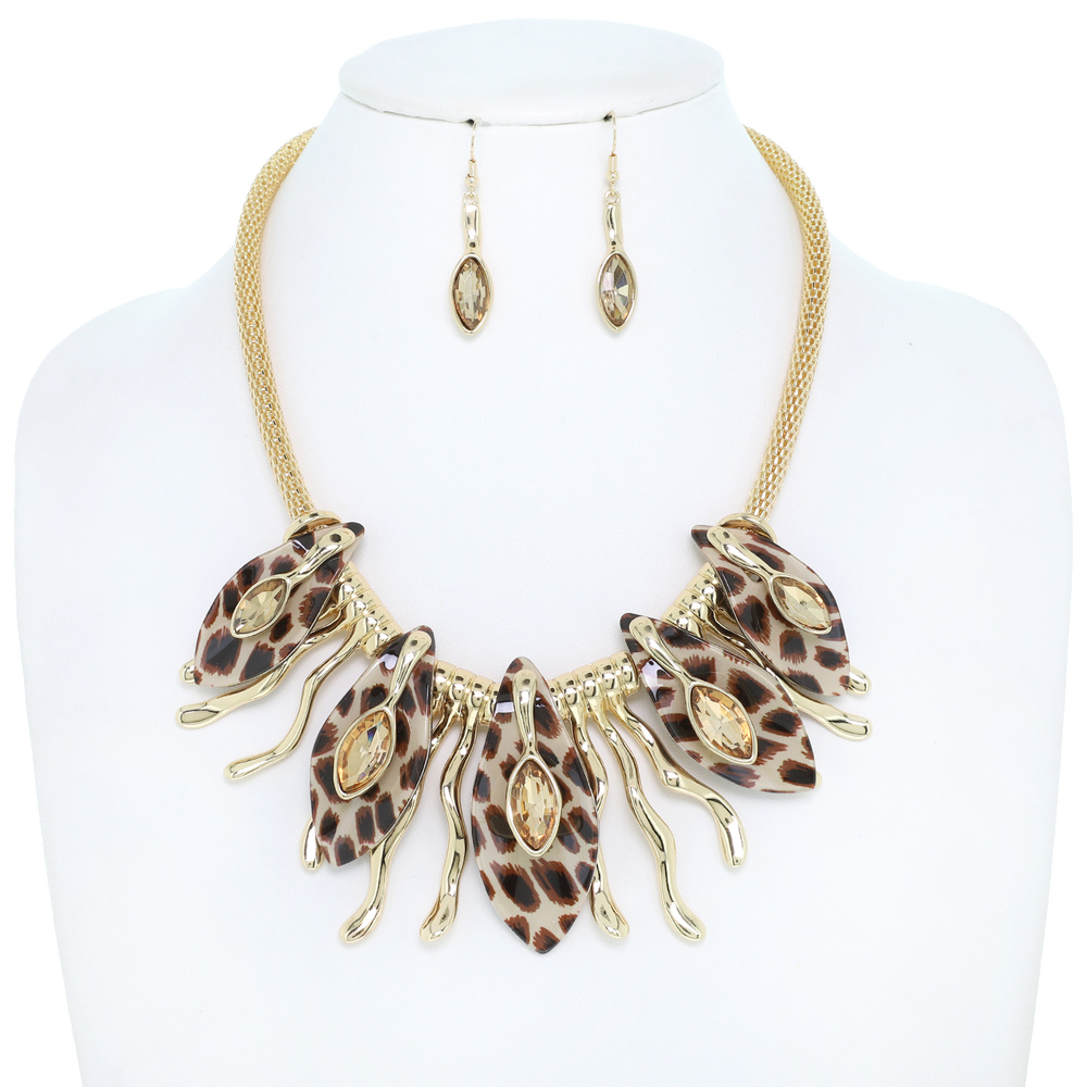 BOHO STYLE ACETATE AND CRYSTAL RHINESTONE PETAL FRINGE ADJUSTABLE NECKLACE EARRING SET