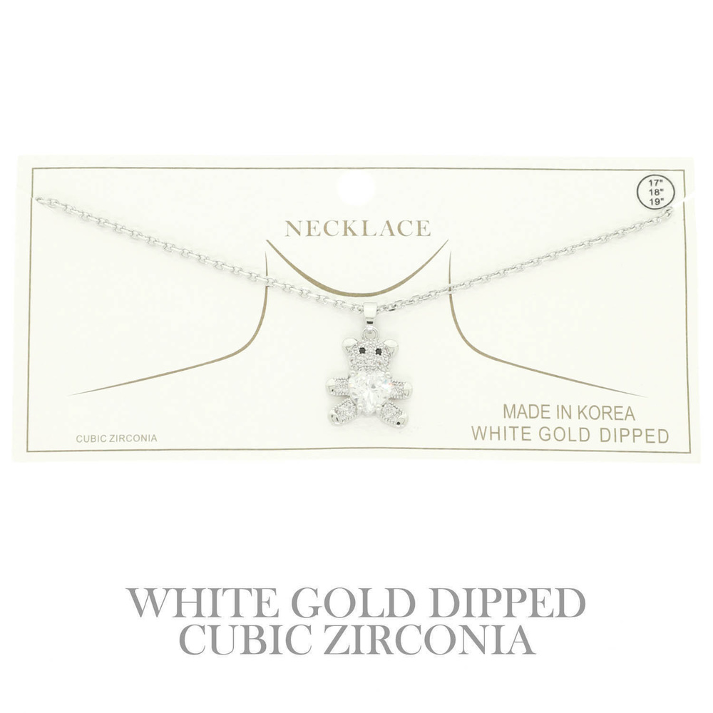 CUBIC ZIRCONIA TEDDY BEAR PENDANT NECKLACE IN WHITE GOLD PLATING