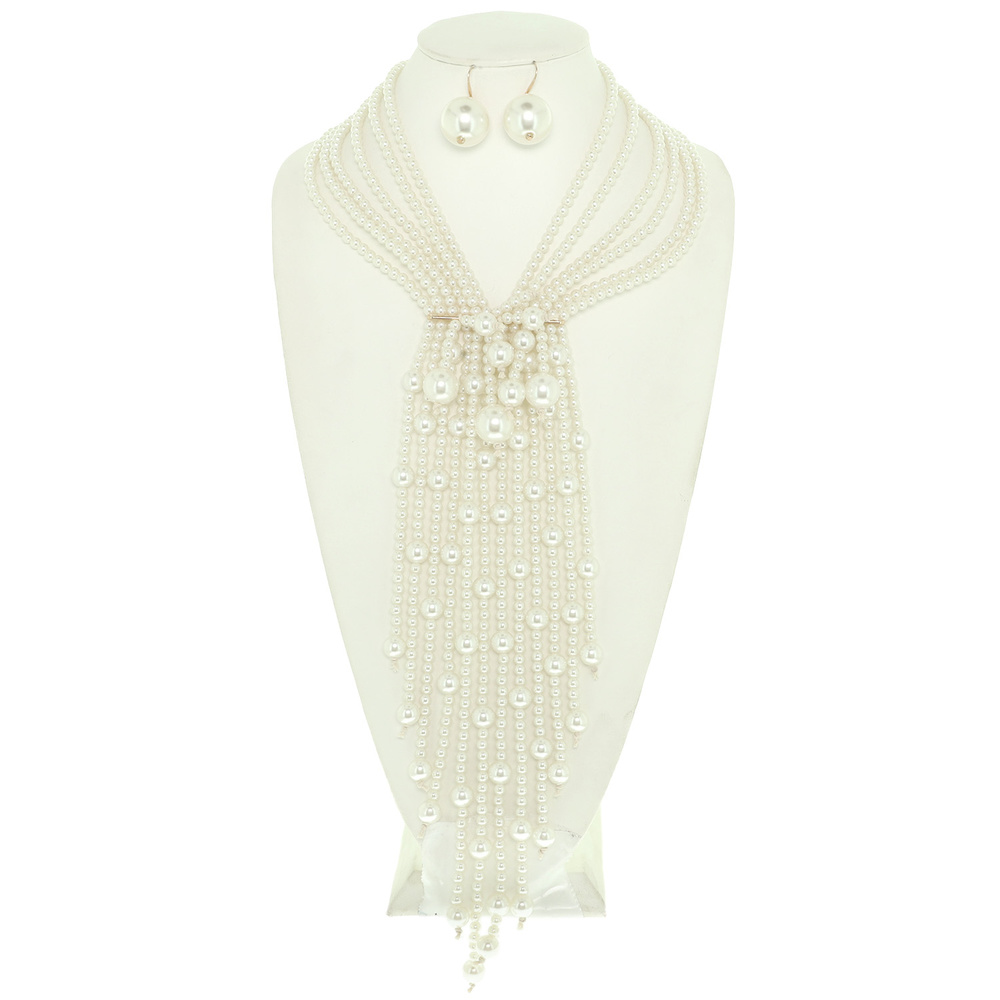 MULTI STRAND CASCADING PEARL BEAD DROP NECKLACE EARRING SET