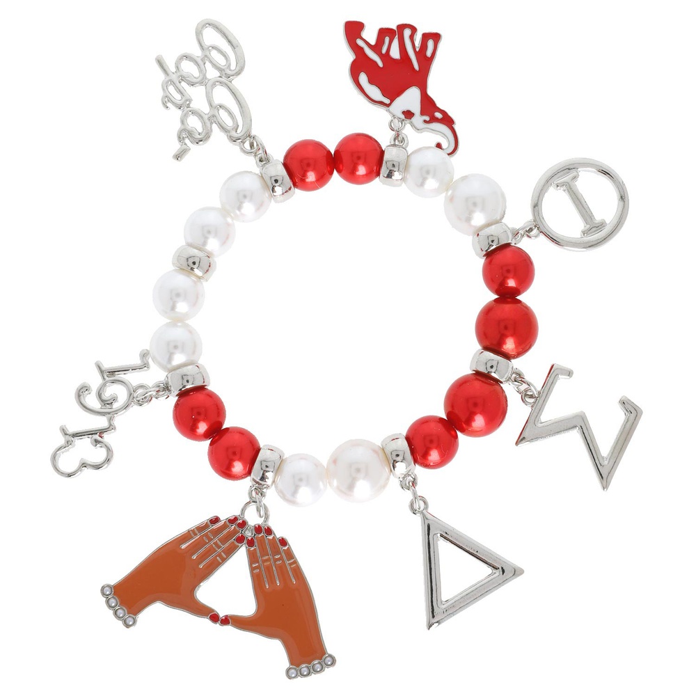 DELTA SIGMA THETA SORORITY MULTI CHARM SYNTHETIC PEARL BEADED STRETCH BRACELET IN SILVER TONE METAL