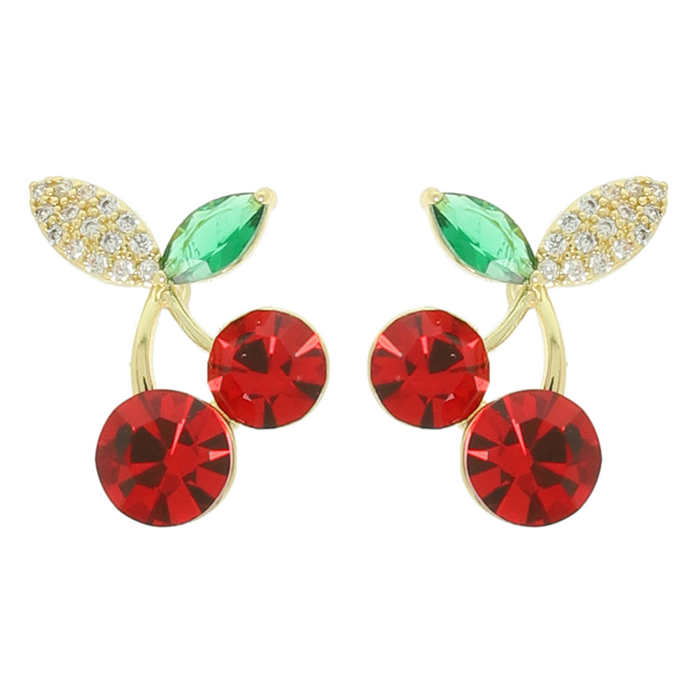 RED AND GREEN CUBIC STONE EMBELLISHED CHERRY CHARM POST DANGLE EARRINGS