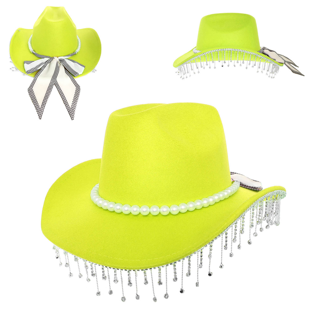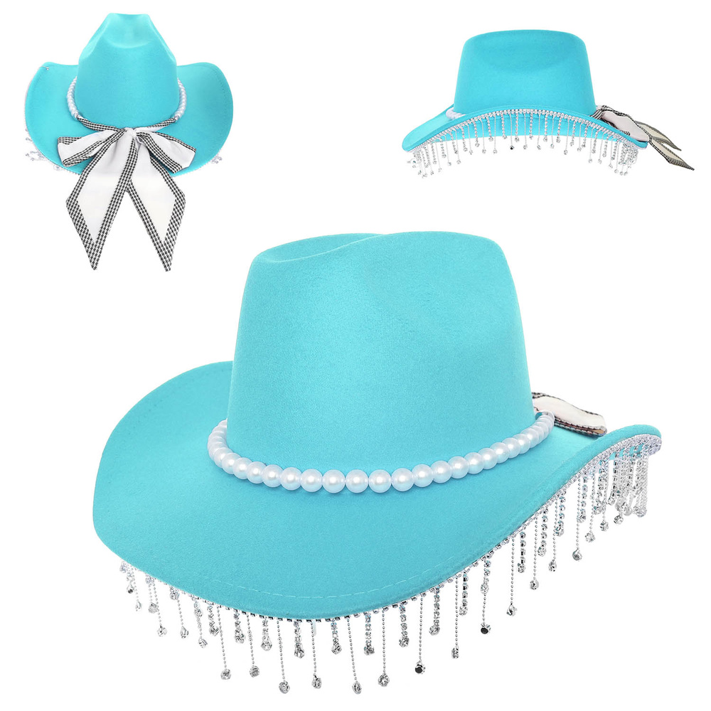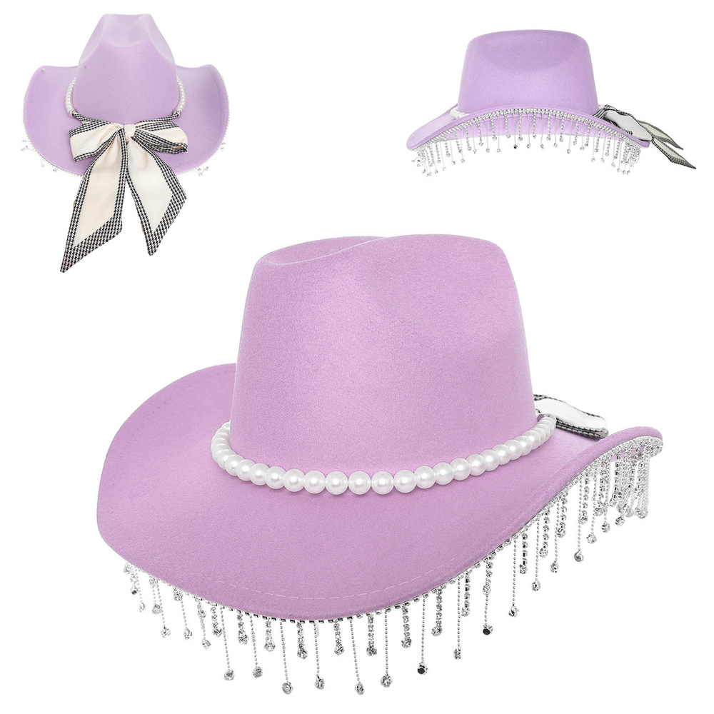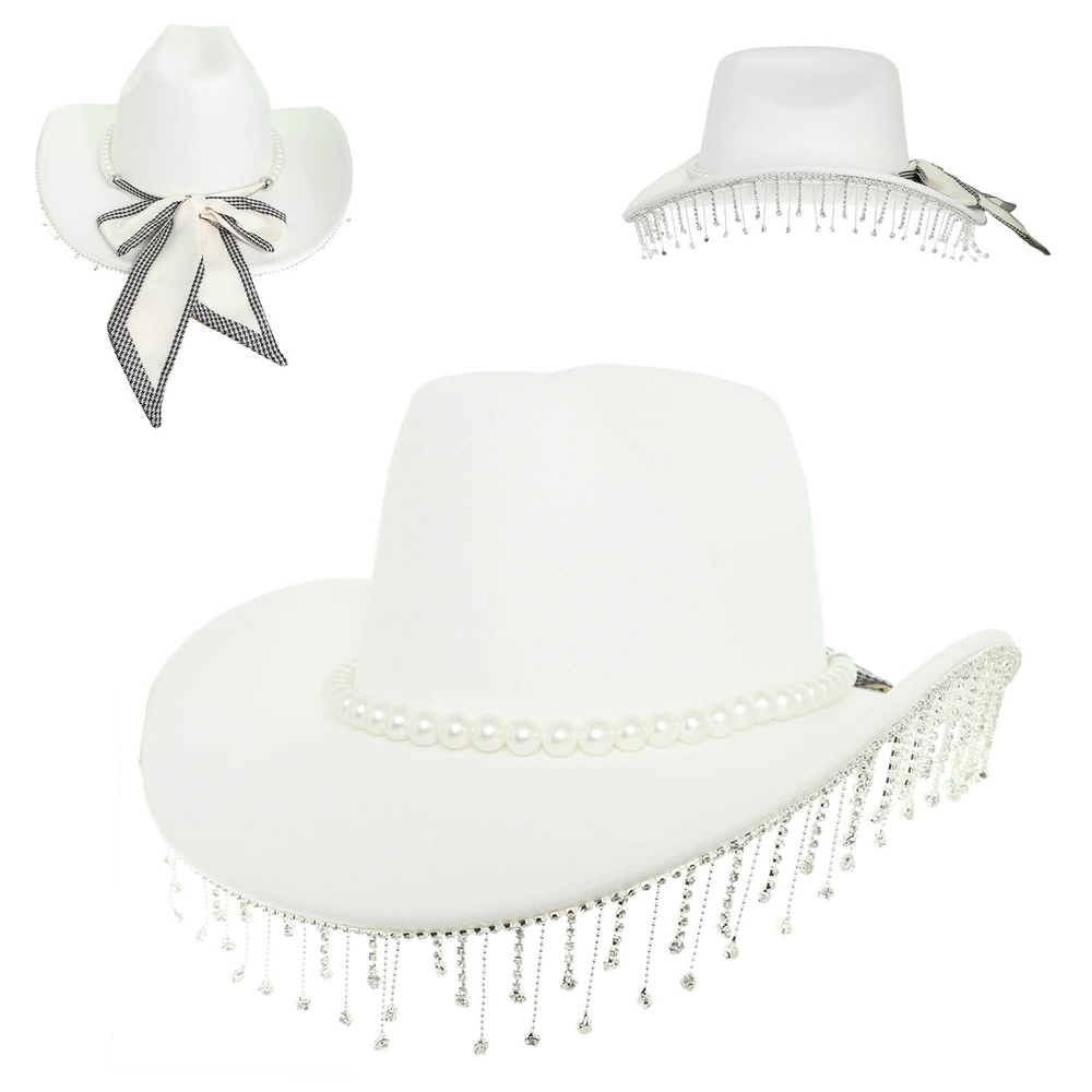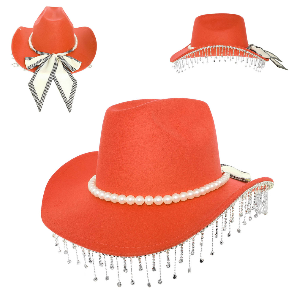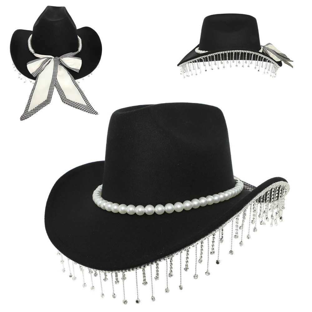 CATTLEMAN STYLED FELT COWBOY HAT WITH PEARL BAND AND CRYSTAL RHINESTONE FRINGE