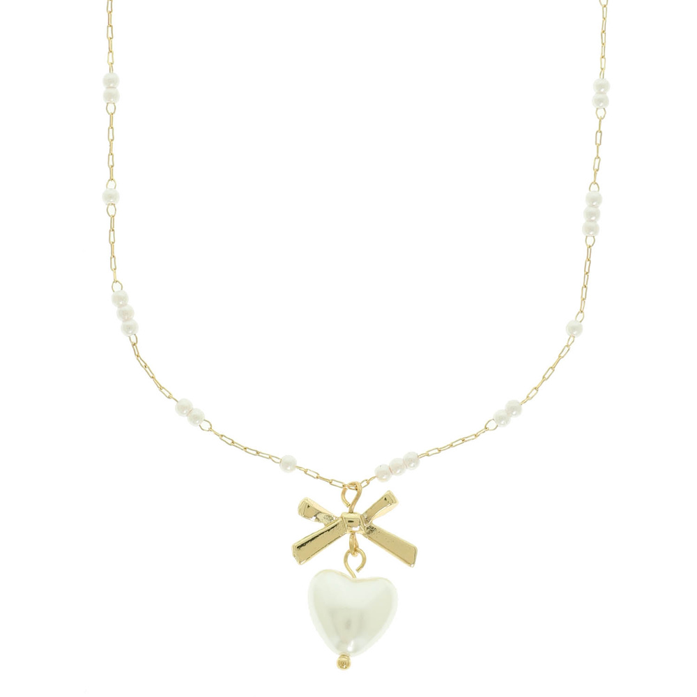 BOW & HEART SHAPED PEARL PENDANT NECKLACE FEATURES PEARL BEADED CHAIN
