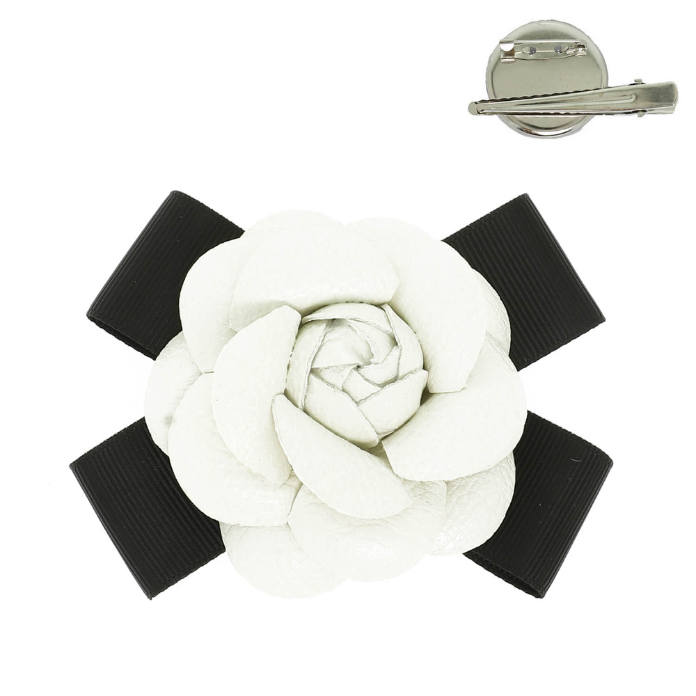 FAUX LEATHER ROSE 2 IN 1 HAIR CLIP / BROOCH PIN FEATURING GROSGRAIN BOW ACCENT