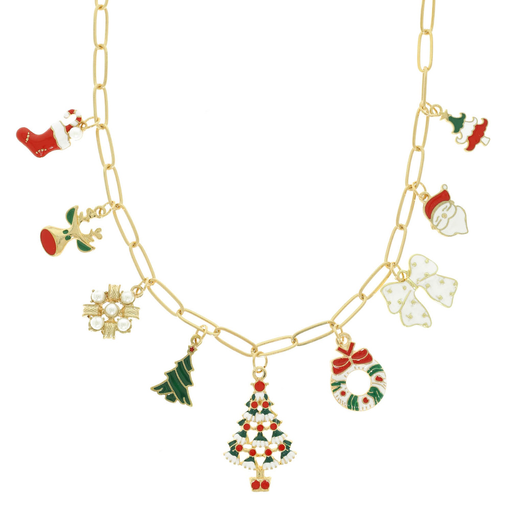CHRISTMAS THEME CHARM NECKLACE WITH ENAMEL AND PEARL ACCENTS