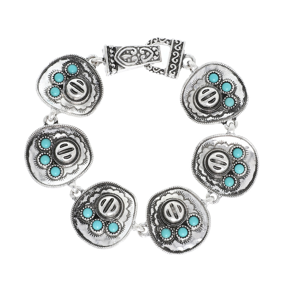 WESTERN TURQUOISE SEMI STONE COWBOY HAT LINK BRACELET WITH MAGNETIC CLOSURE IN OXIDIZED SILVER TONE METAL