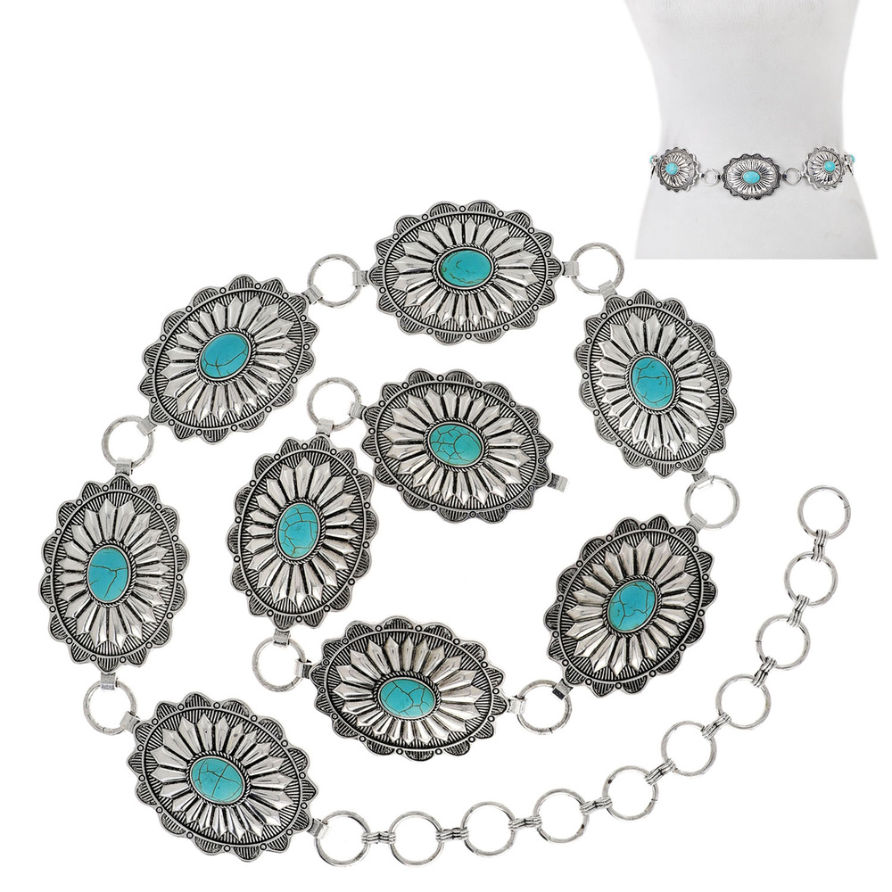 Western Turquoise Stone Sunburst Flower Concho Metal Chain Link Hip Belt