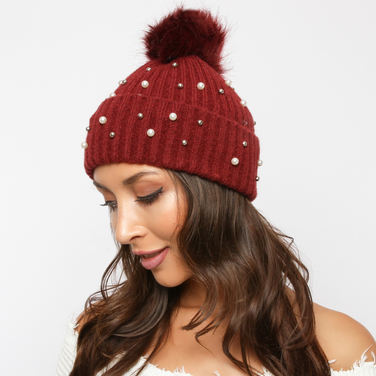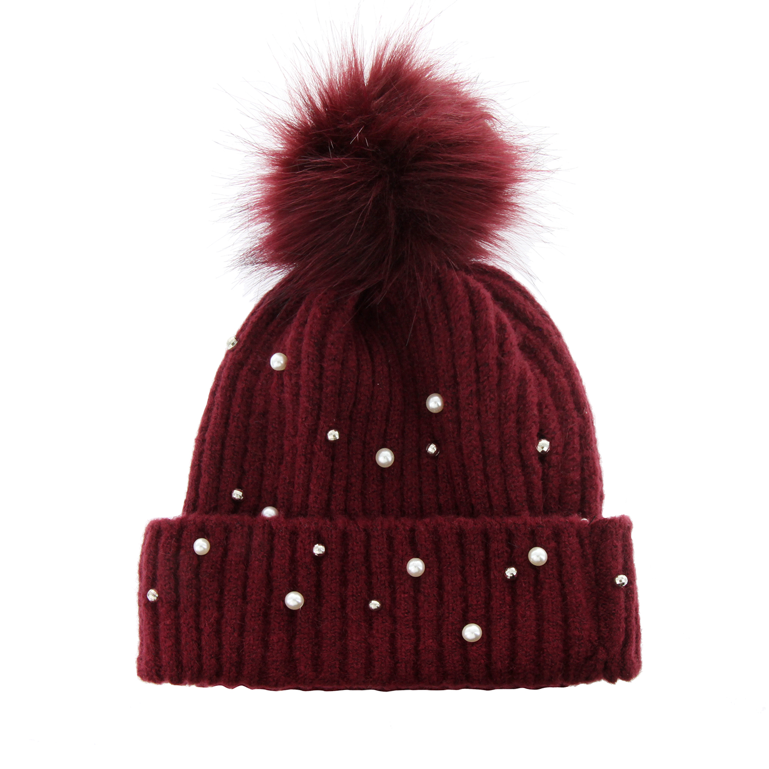 BEANIE W/ PEARLS & FAUX FUR POM POM