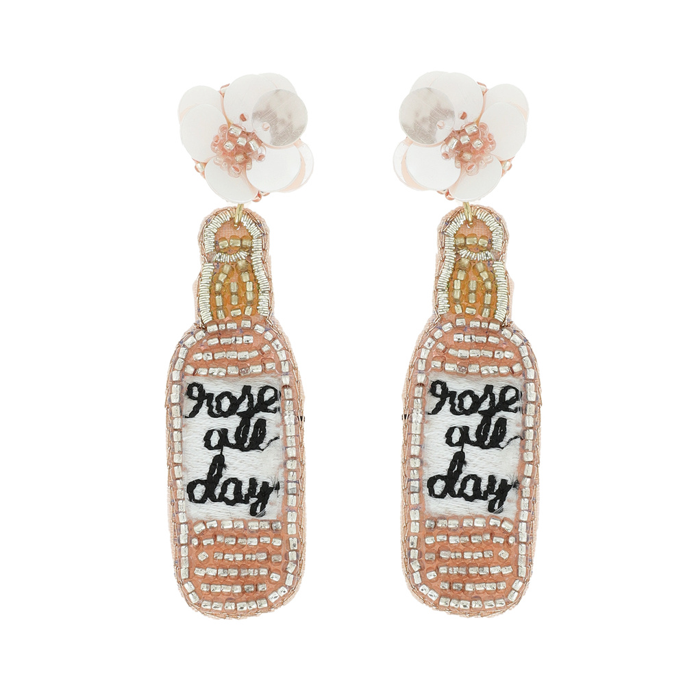 Rose All Day Wine Bottle With Sequin Flower Bead Embroidery Dangle Earrings