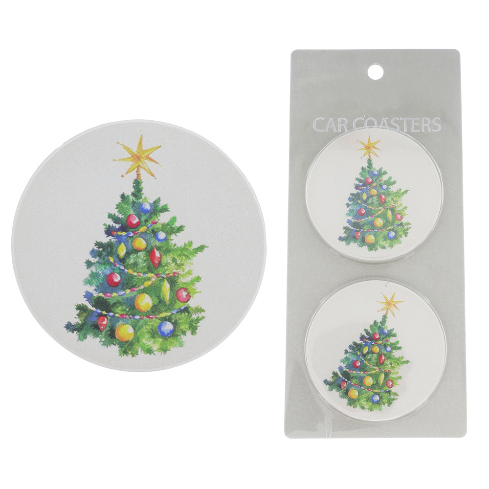 2-piece Vintage Christmas Tree Cork Base Ceramic Absorbent Car Coaster Set