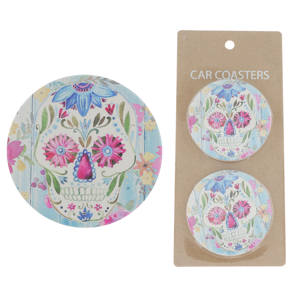 2-PIECE SUGAR SKULL DAY OF THE DEAD CORK BASE CERAMIC ABSORBENT CAR COASTER SET