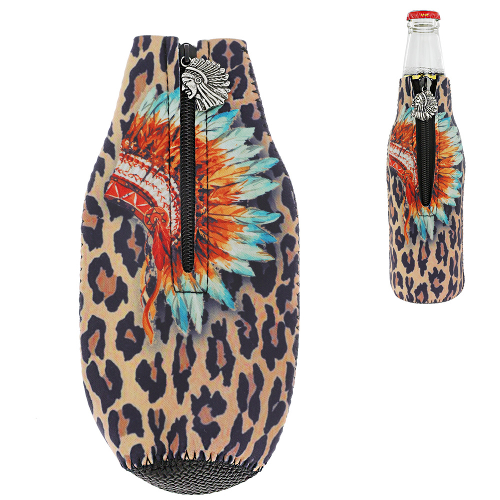 NATIVE AMERICAN -WILD WEST THEMED ZIP-UP DRINKING SLEEVE INSULATED BOTTLE HOLDER WITH ZIG -ZAG STITCHING AND ZIPPER PENDANT
