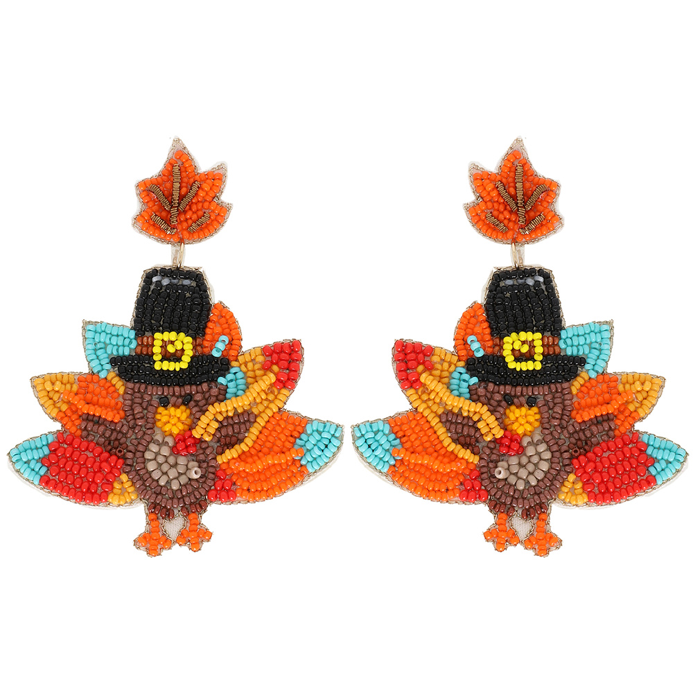 2-TIER LEAF POST THANKSGIVING PILGRIM TURKEY BEADED EMBROIDERY DANGLE AND DROP EARRINGS