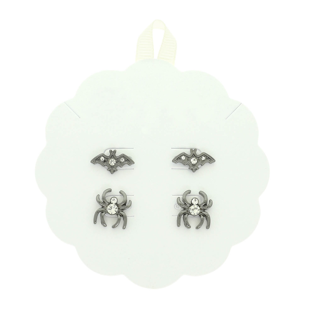 TWO PAIR STUD EARRING SET WITH SILVER-TONE BAT AND SPIDER WITH CRYSTAL ACCENTS