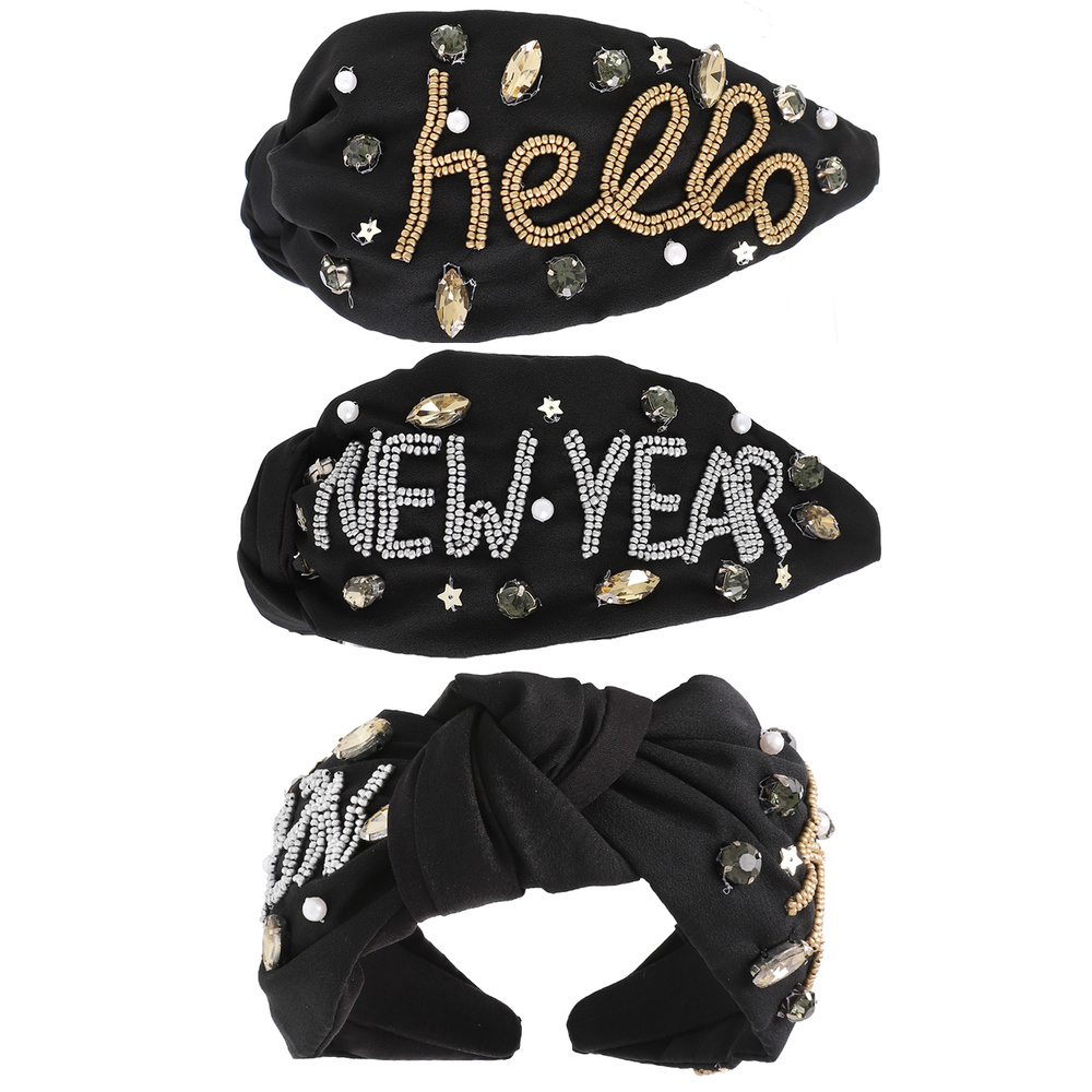 "HELLO NEW YEAR" CRYSTAL RHINESTONE BEADED TOP KNOT HANDMADE HEADBAND