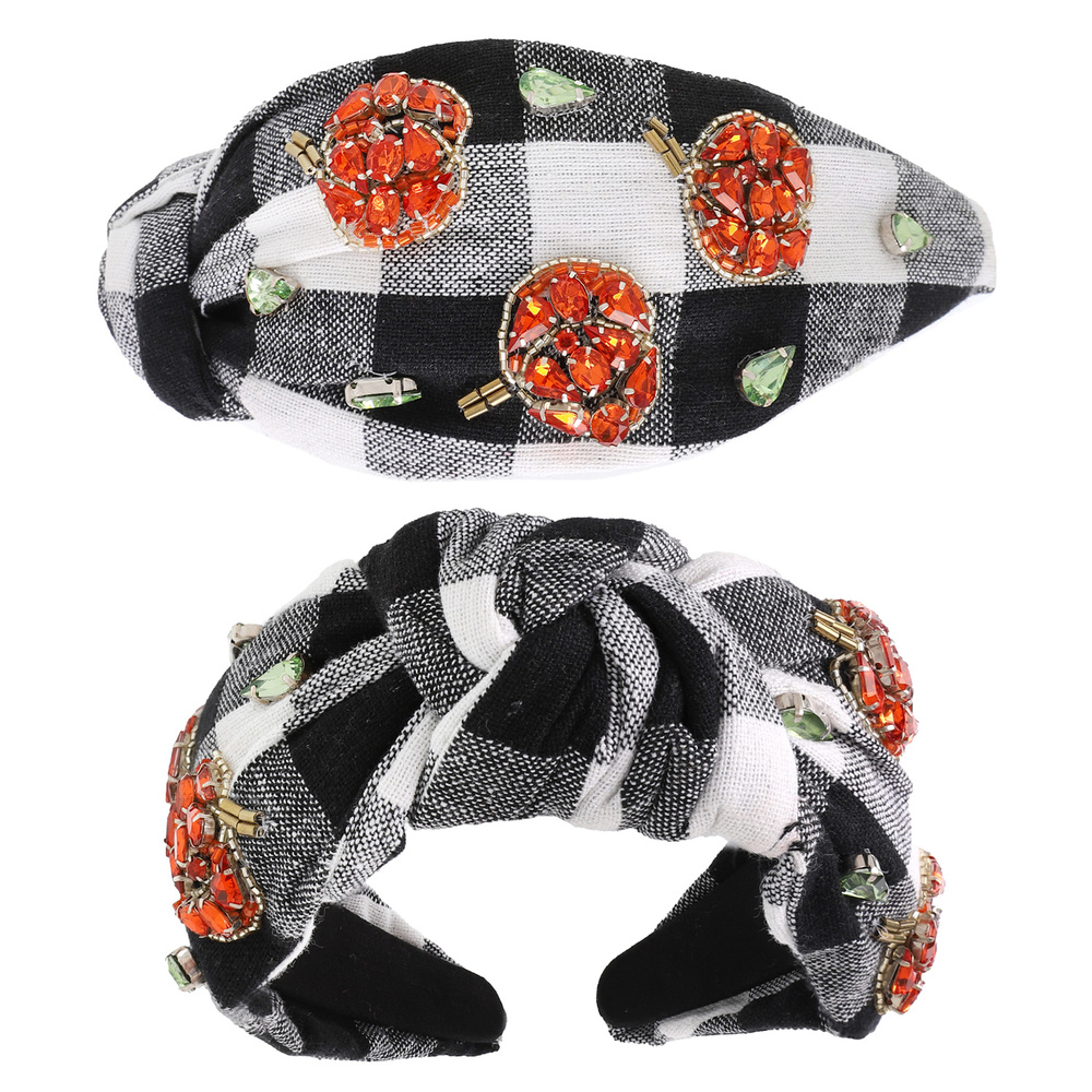 PUMPKIN THANKSGIVING CRYSTAL GEMSTONE GINGHAM PATTERN TOP KNOT HANDMADE HEADBAND