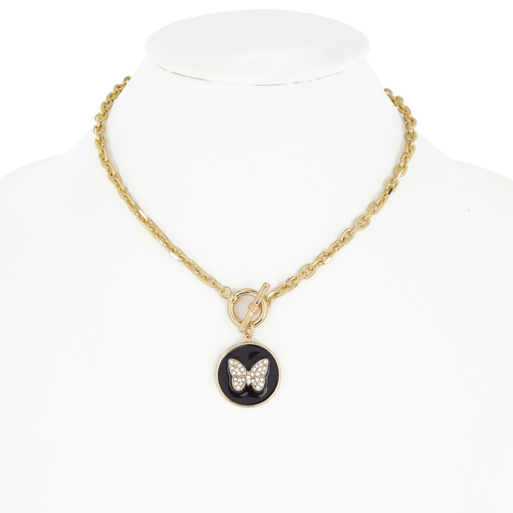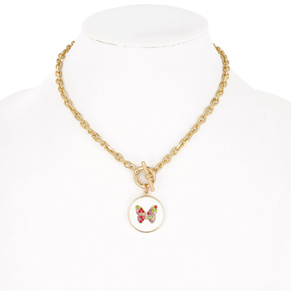 RHINESTONE PAVE ENAMEL BUTTERFLY COIN CHARM TOGGLE NECKLACE