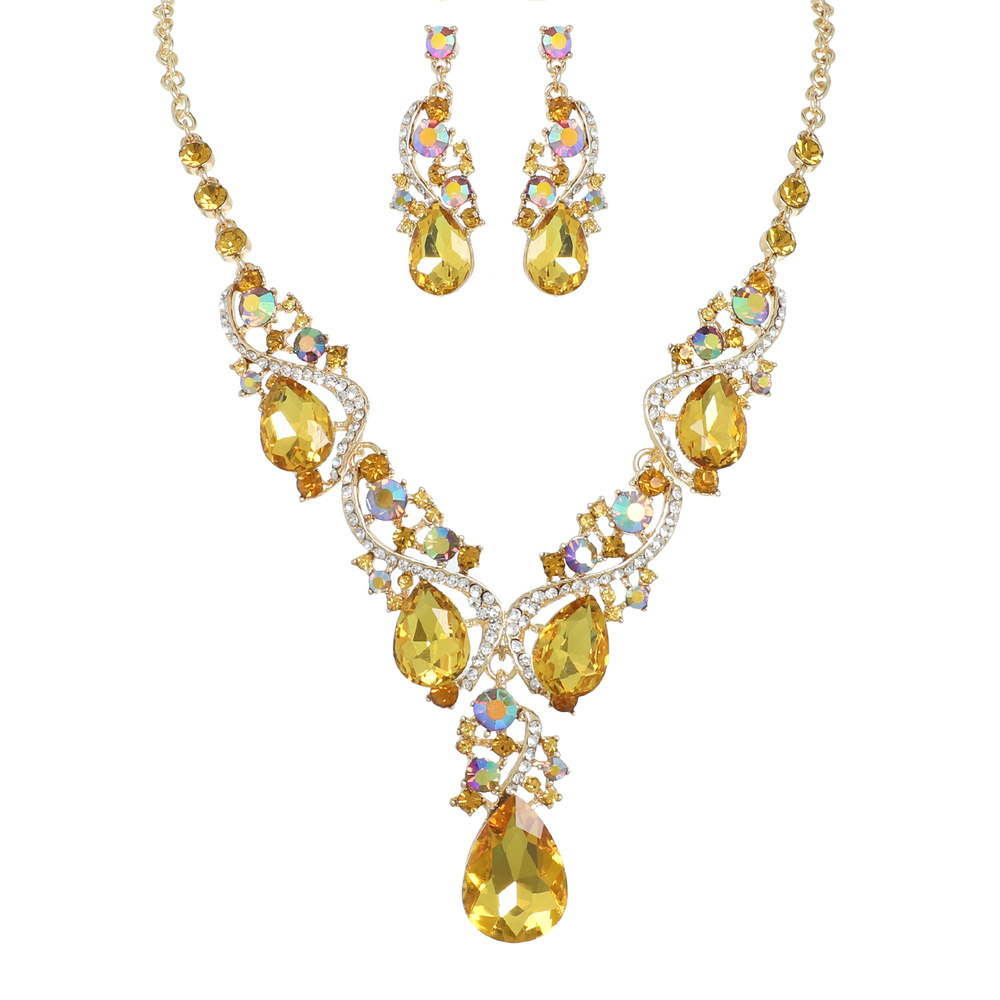 CRYSTAL GEMSTONE TEARDROP CLUSTER V-SHAPED ADJUSTABLE NECKLACE EARRING SET