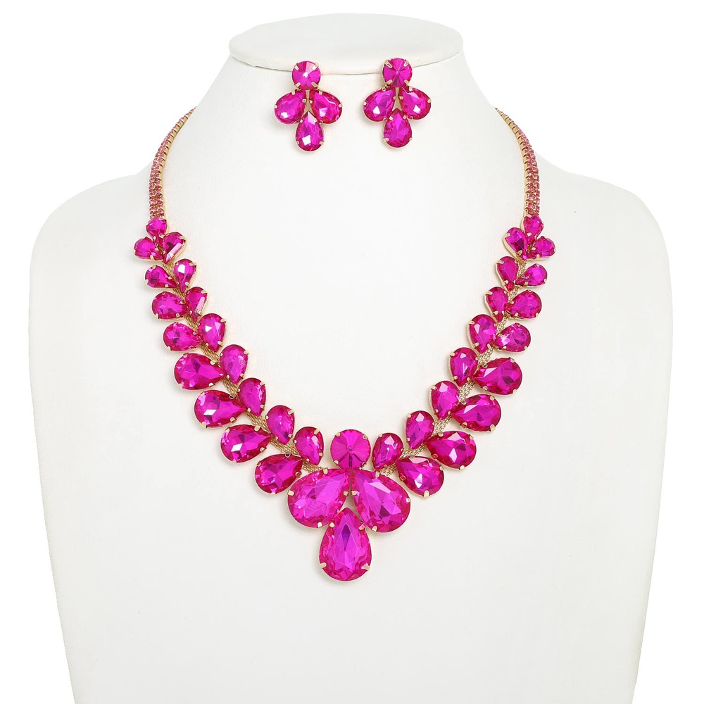 CRYSTAL GEMSTONE TEARDROP CLUSTER V-SHAPED SCALLOPED ADJUSTABLE NECKLACE SET