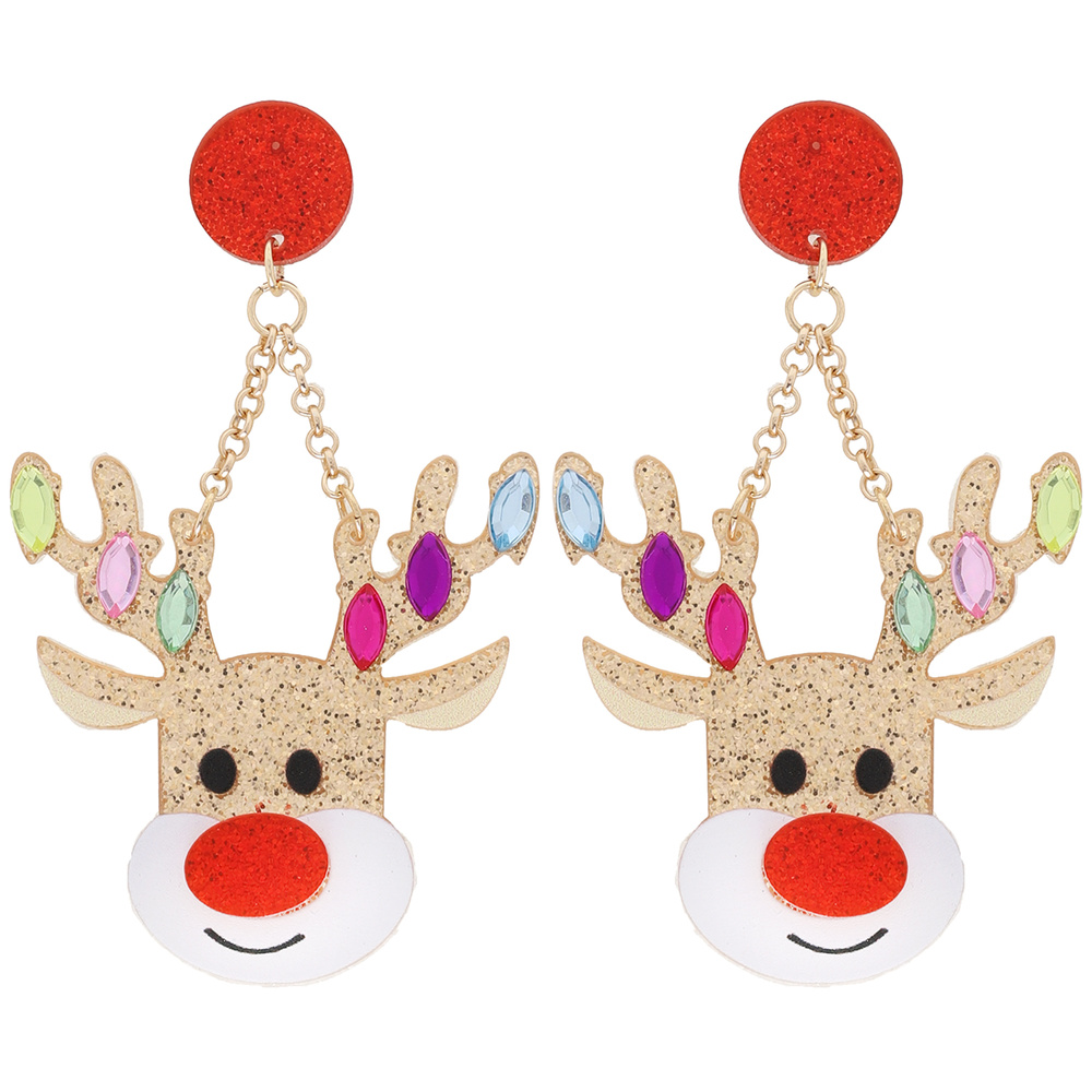 2-TIER RUDOLPH CHRISTMAS LIGHTS ANTLERS GLITTER ACETATE CRYSTAL GEMSTONE CHAIN DANGLE EARRINGS