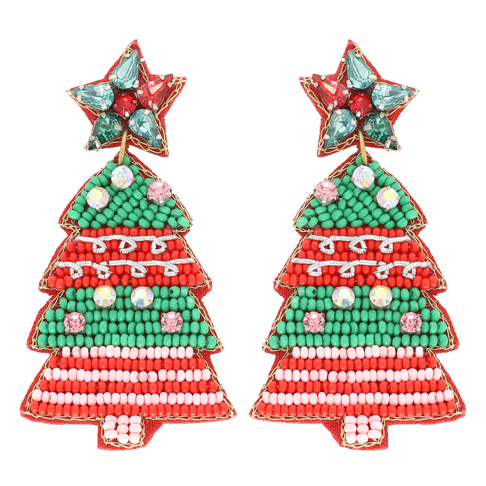 2-TIER STAR POST LAYERED CHRISTMAS TREE CRYSTAL RHINESTONE BEADED EMBROIDERY LONG DROP EARRINGS