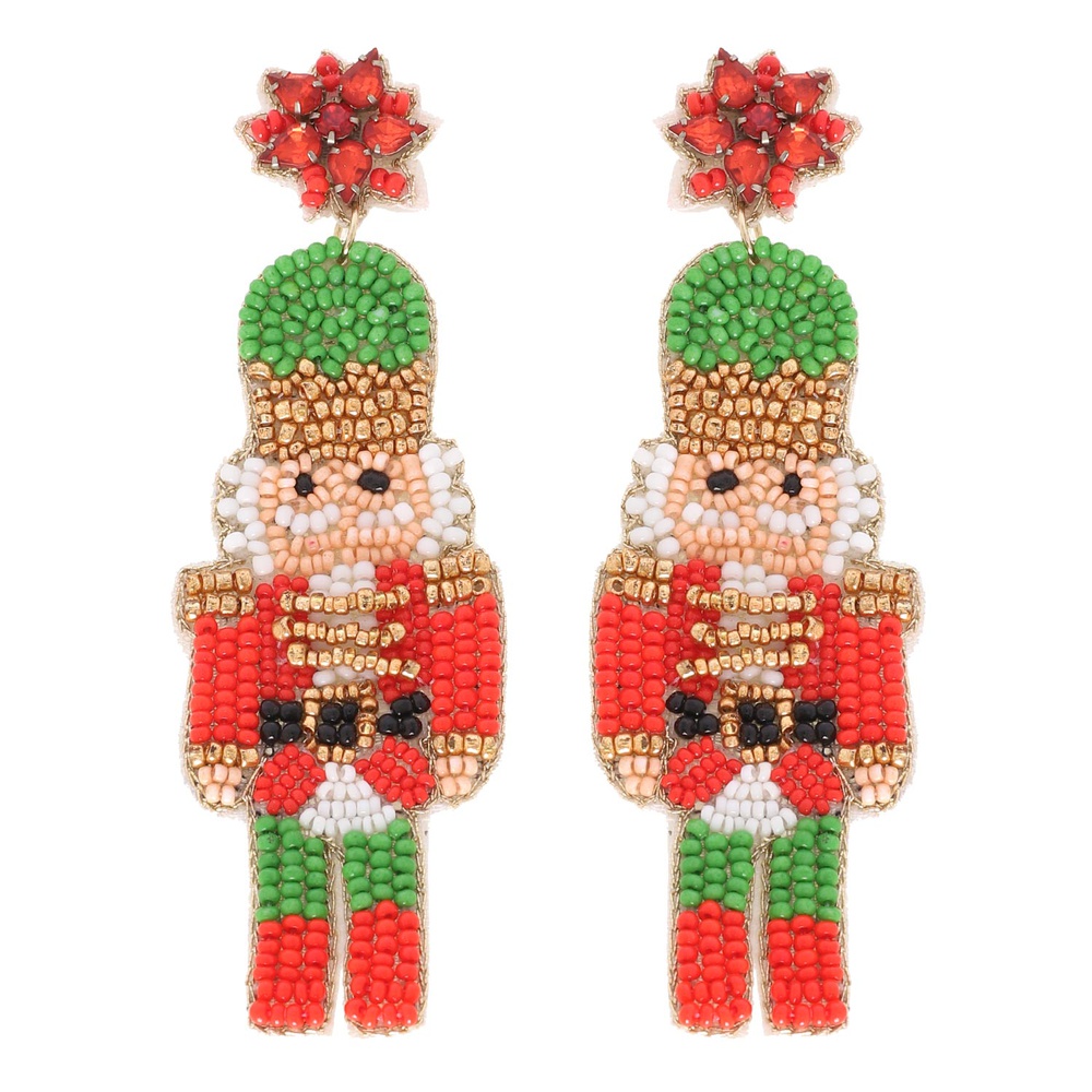 2-TIER NUTCRACKER SEED BEAD HANDMADE BEADED EMBROIDERY CRYSTAL RHINESTONE LONG DROP EARRINGS IN GOLD TONE METAL