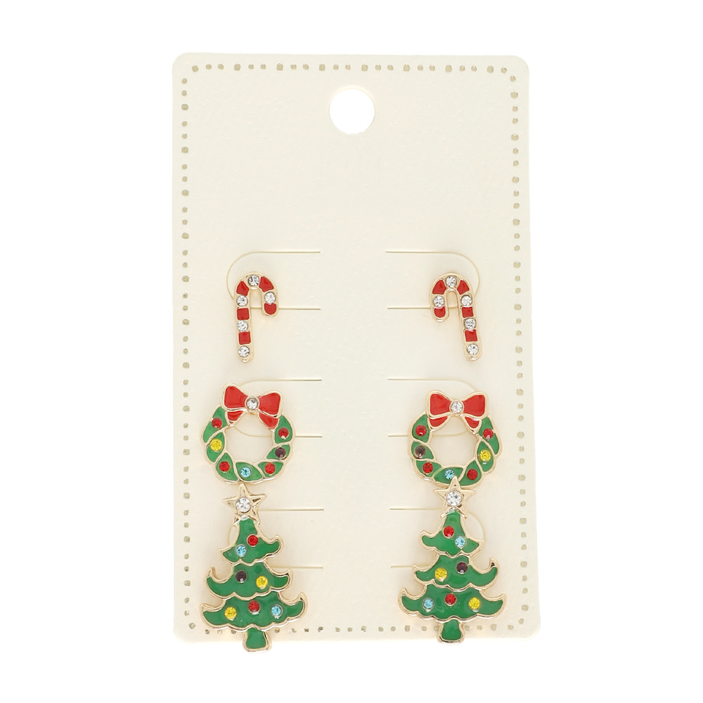3-PACK CHRISTMAS CANDY CANE WREATH TREE EPOXY RHINESTONE POST EARRINGS
