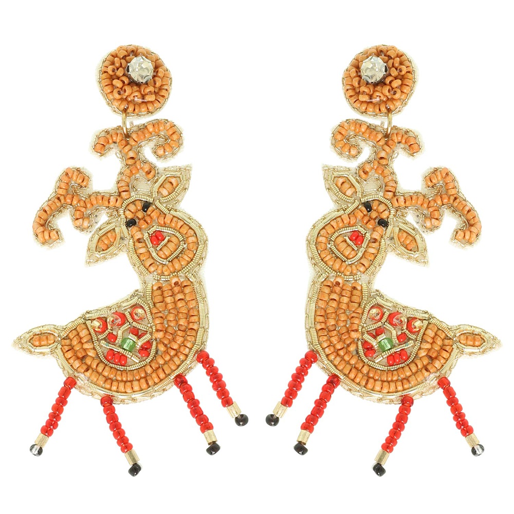 CHRISTMAS RED NOSE REINDEER SEED BEADED POST DANGLE EARRINGS WITH CRYSTAL ACCENTS