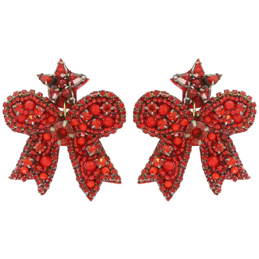 HOLIDAY CHRISTMAS BOW SEED BEADED POST DANGLE EARRINGS WITH CRYSTAL EMBELLISHMENTS