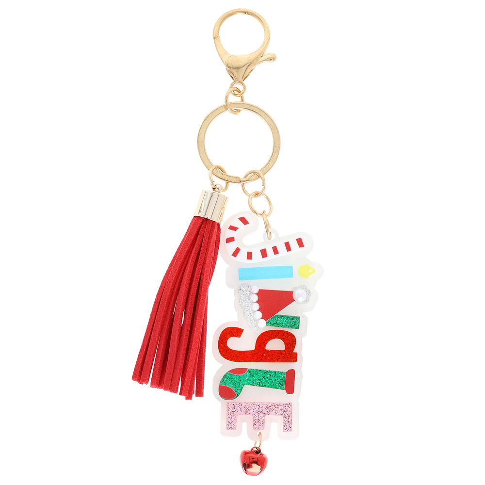 "JINGLE" GLITTER ACETATE MULTI CHARM JINGLE BELL TASSEL KEYCHAIN WITH DUAL SPLIT RING AND LOBSTER CLAW CLASP IN GOLD TONE METAL
